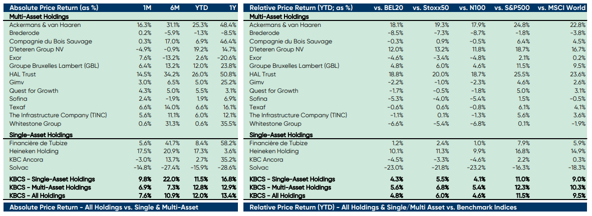 De beste relatieve prestaties tegenover de BEL20 kwamen van HAL Trust (+19,2%), Ackermans & Van Haaren (+18,0%) en D’Ieteren (+11,9%). De zwakste relatieve prestaties waren er voor Solvac (-23,1%), Brederode (-8,6%) en Whitestone Group (-6,7%).