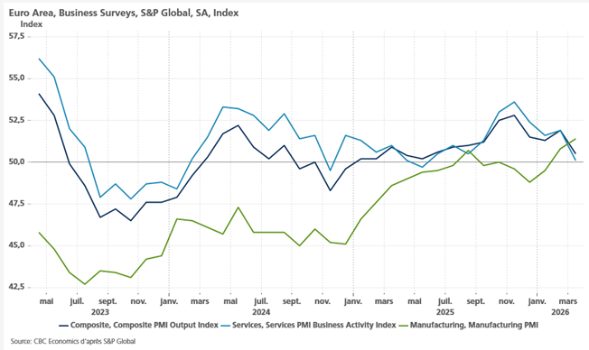 De ECB heeft een waaier aan informatie om inzicht te krijgen in tweede-ronde inflatie-effecten, iets waar de ze echt bezorgd om is. De deze ochtend gepubliceerde PMI-bedrijfsvertrouwensenquêtes worden minutieus tegen dit lijstje afgezet, want die zijn de eerste échte barometer over de Europese economie sinds de oorlog. De titel van het perscommuniqué laat weinig ruimte voor twijfel: “de outputgroei in de economie vertraagt terwijl inputkosten het hoogste peil in meer dan 3 jaar aantikten. Peter Wuyts, Senior Market Strategist uit de KBC-marktenzaal, verdiept zich in het onderwerp.